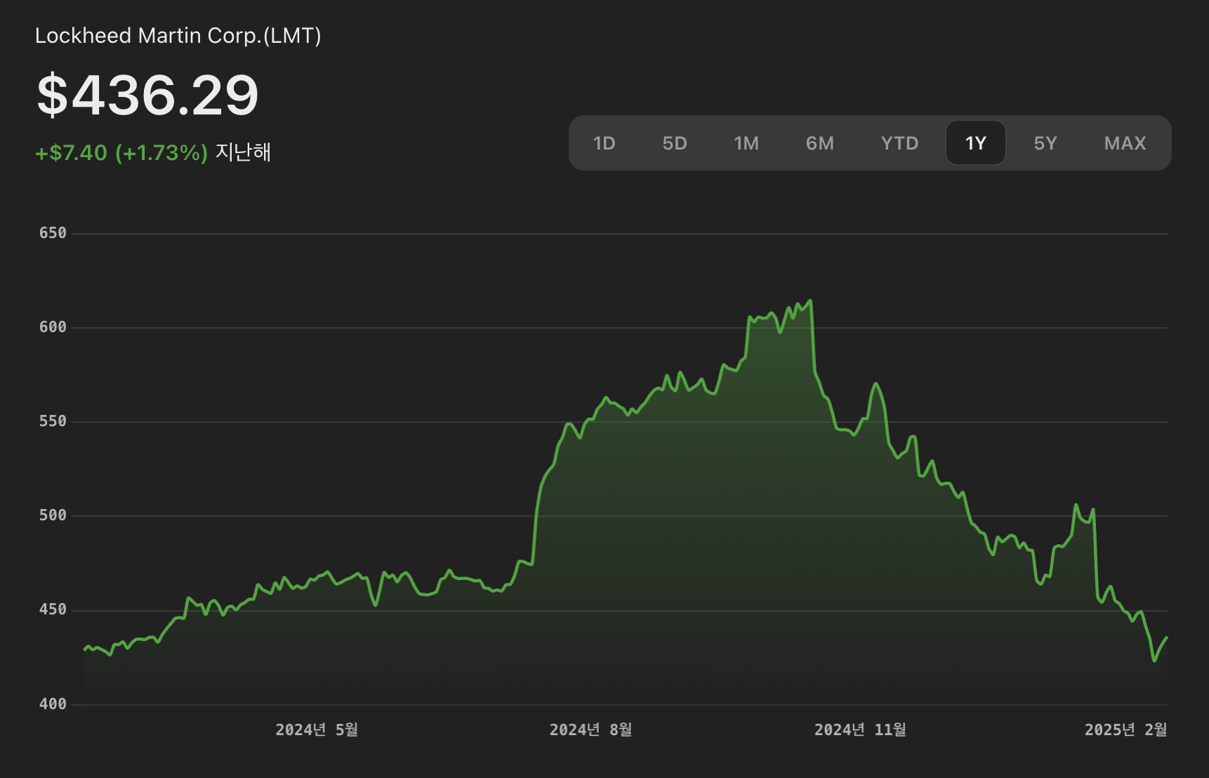 • 현재 주가 및 전망: 록히드 마틴의 주가는 안정적인 성장세를 유지하고 있으며, 향후 우주 탐사 및 방위 산업 성장과 함께 꾸준한 상승세를 이어갈 것으로 전망됩니다.